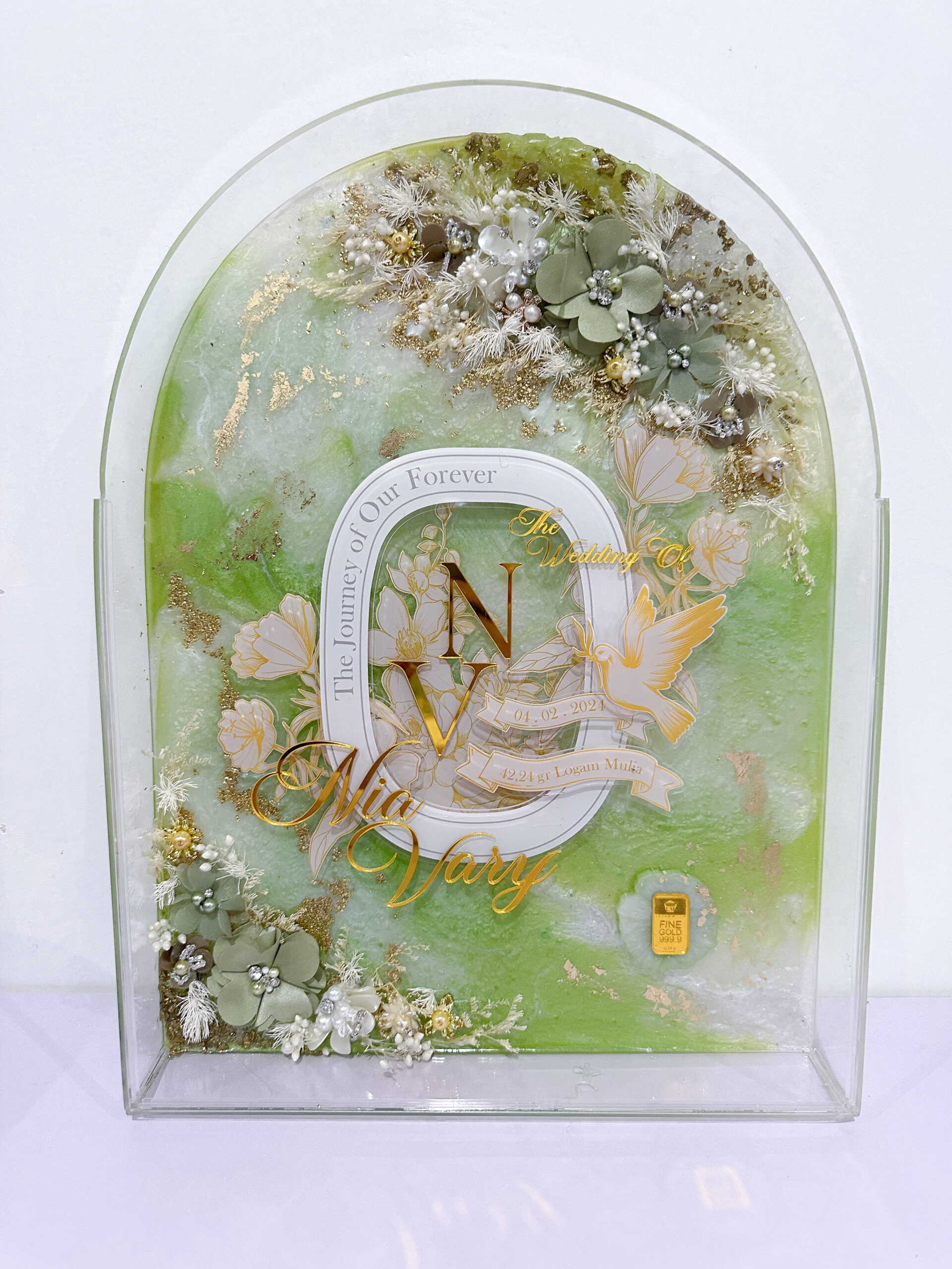 Mahar Simbolis Bingkai Akrilik Ukuran 30 x 40 cm. Isi akrilik print uv latar wallpaper. Bisa ganti ukuran bingkai, warna dan ornamen.