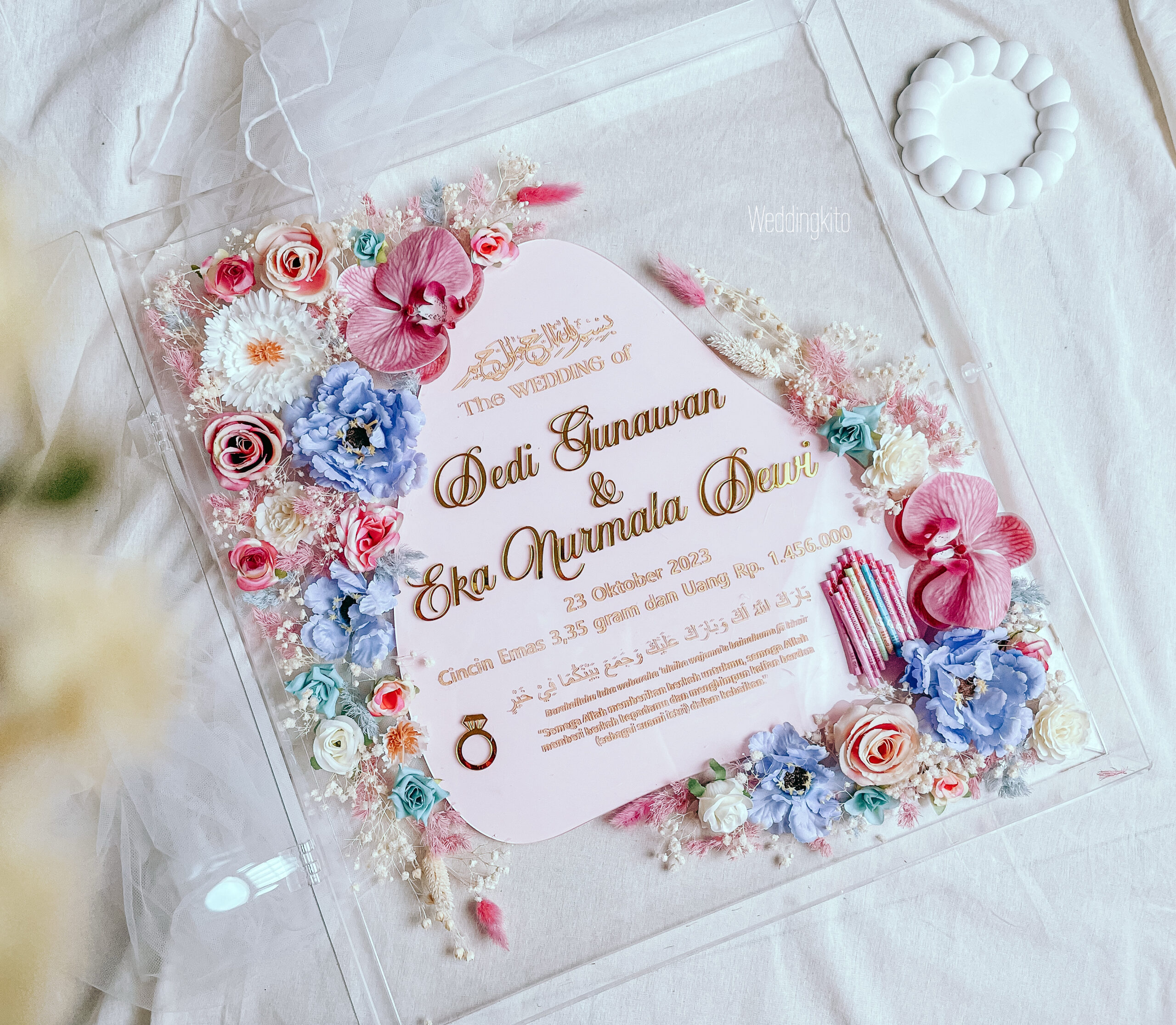 Mahar Simbolis Bingkai Akrilik ukuran beda beda Mohon discreenshot ke WA untuk tau ukuran yg tepat nya ya. Isi akrilik print uv latar wallpaper. Bisa ganti ukuran bingkai, warna dan ornamen.