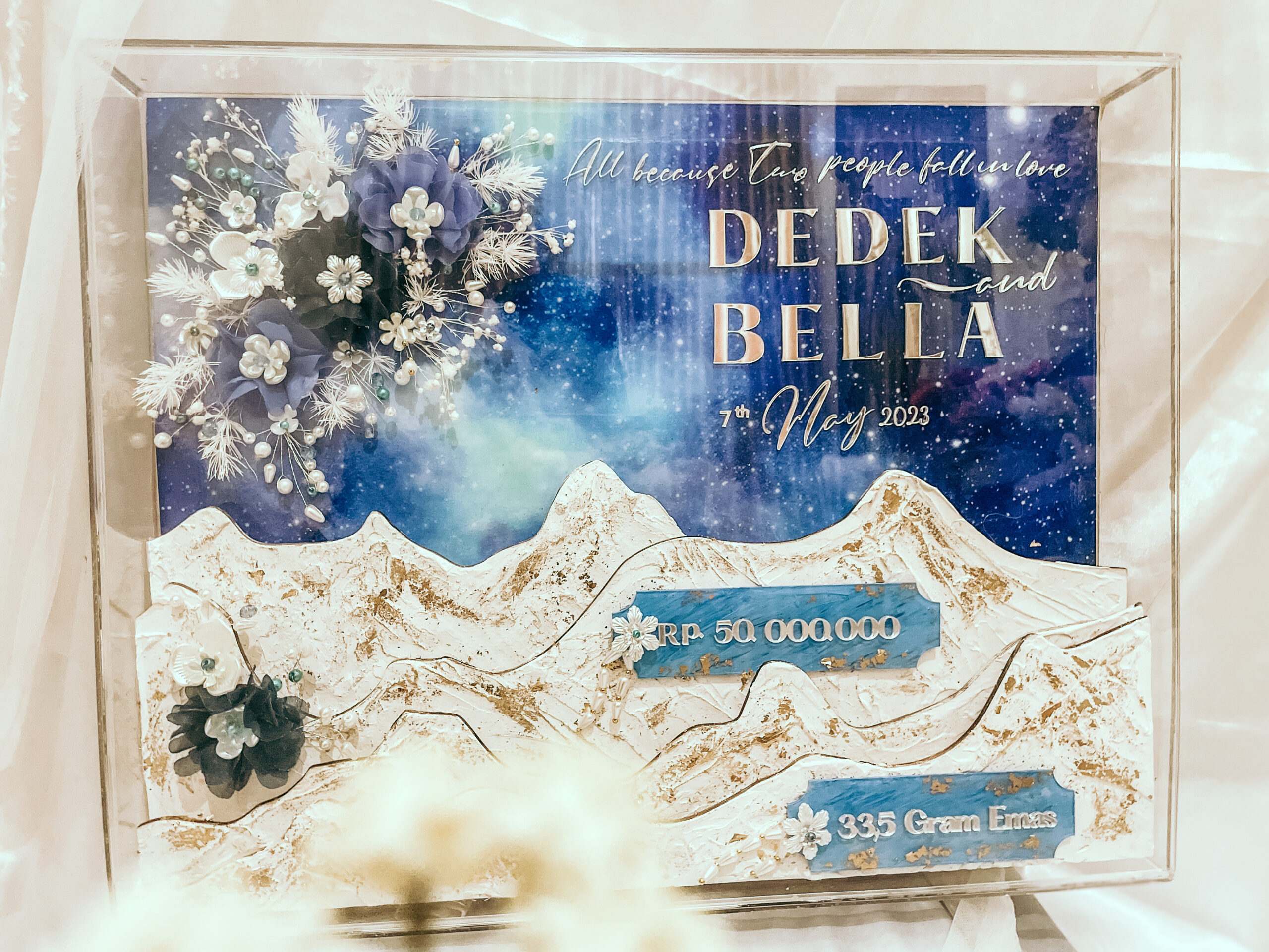Mahar Simbolis Bingkai Akrilik Ukuran 35 x 35 cm. Isi akrilik print uv latar wallpaper. Bisa ganti ukuran bingkai, warna dan ornamen.